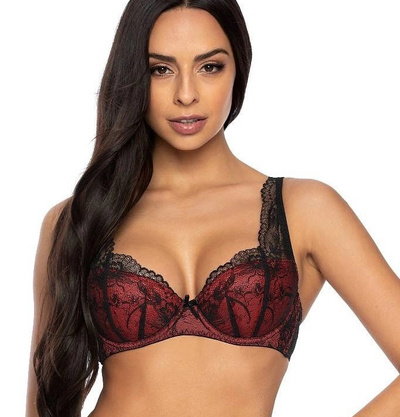 Biustonosz z usztywnianymi miseczkami pokrytymi koronką, podszyte bawełną w czerwonym kolorze. Boczki z tiulu. Ramiączka regulowane, nieodpinane.