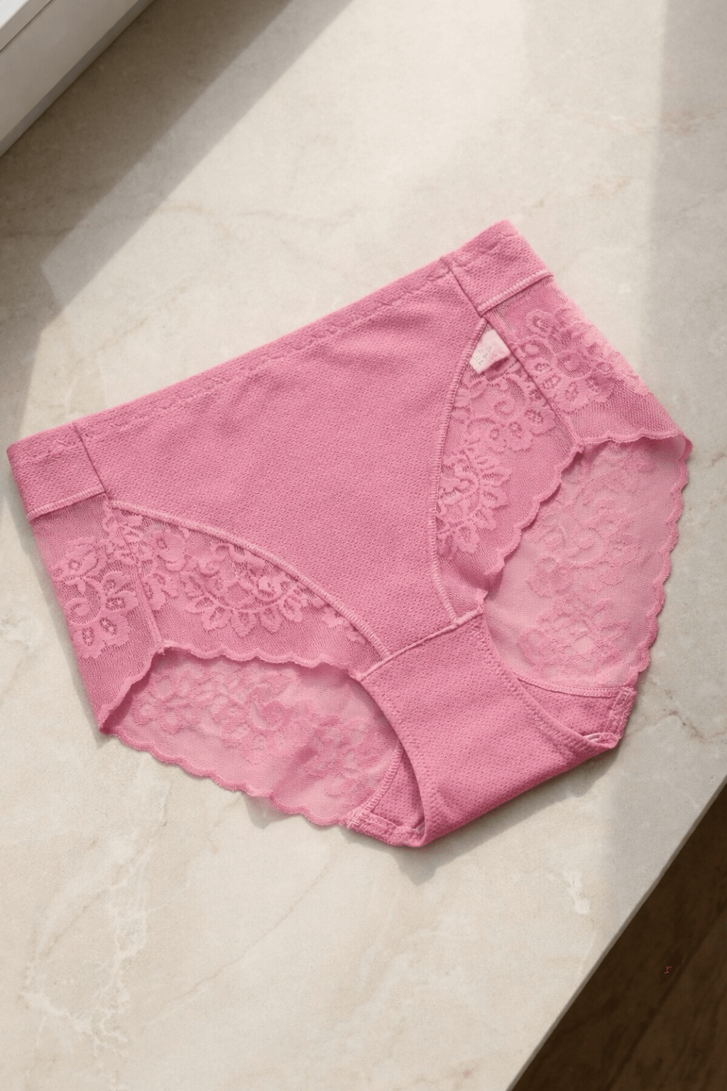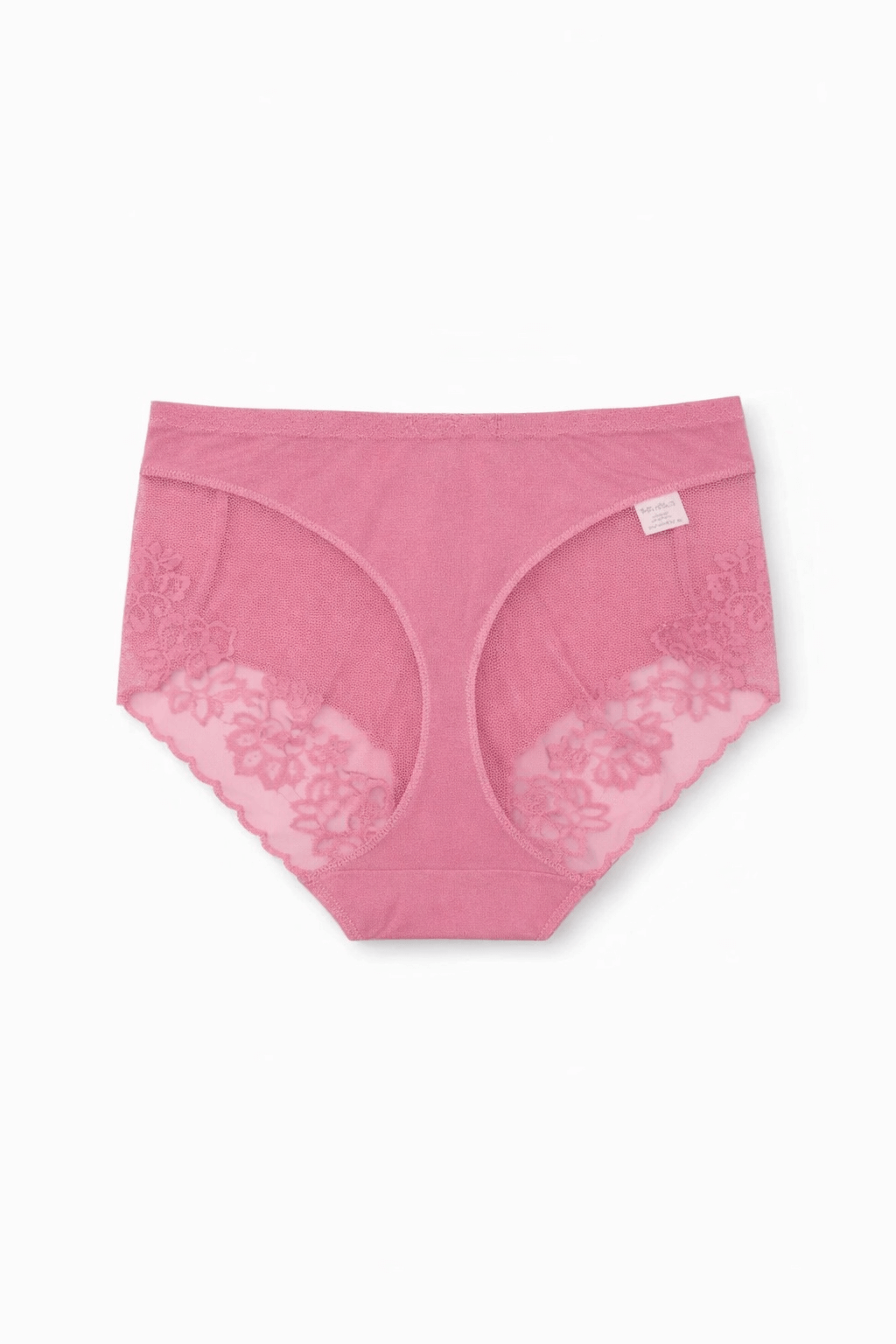 Bezszwowe figi damskie z mikrofibry brudny róż zostały wykończone delikatnym tiulem o kwiatowym motywie, który dodaje bieliźnie elegancji i lekkości. Gładkie krawędzie sprawiają, że figi nie odznaczają się pod ubraniem, dzięki czemu są doskonałym wyborem pod dopasowane sukienki, spódnice oraz spodnie.