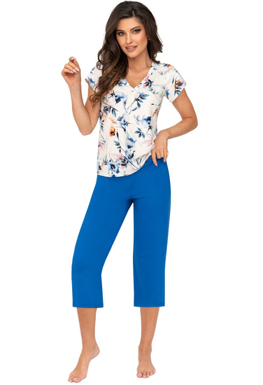 Spodnie 3/4 w jednolitym kobaltowym kolorze doskonale komponują się z wzorzystą górą, tworząc harmonijną całość. Wiskozowy materiał, z którego wykonano piżamę, jest miękki, lekki i przyjemny w dotyku, co gwarantuje komfort noszenia przez całą noc.