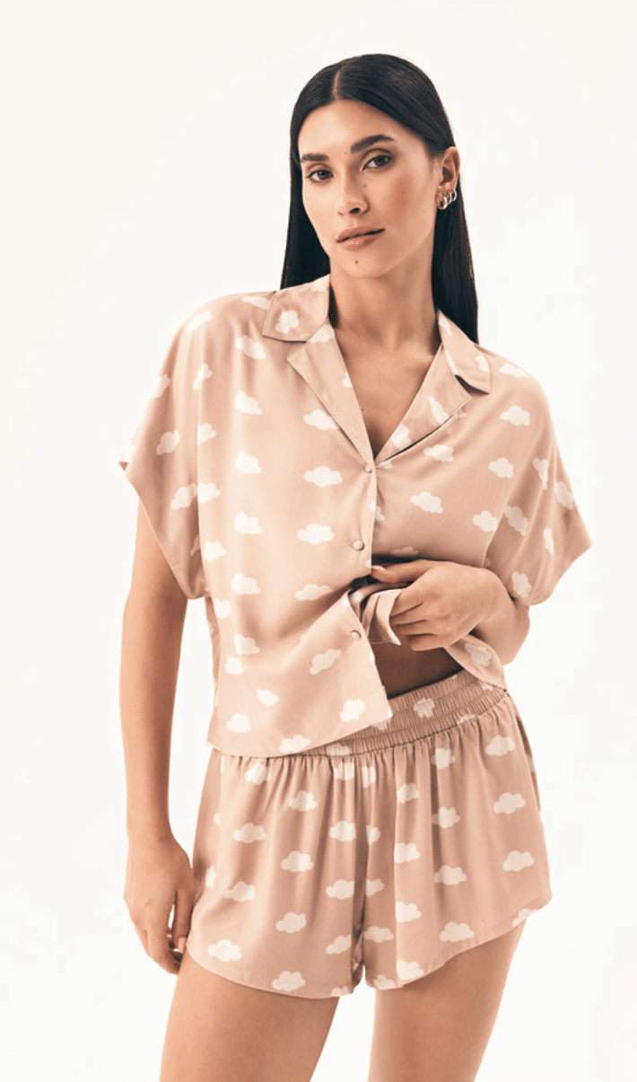 - Modny design – beżowa piżama z subtelnym wzorem białych chmurek.