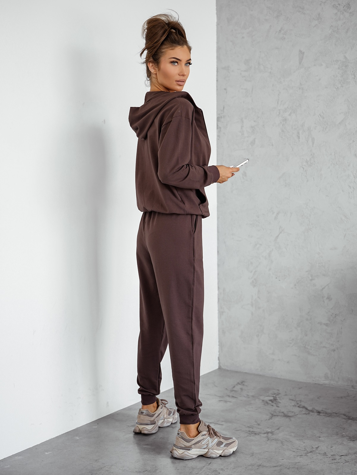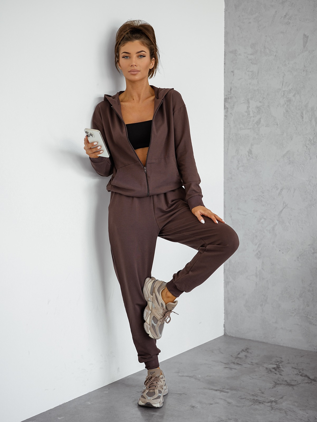 • Elegancki damski komplet dresowy – bluza z kapturem i spodnie zwężane ze ściągaczami.