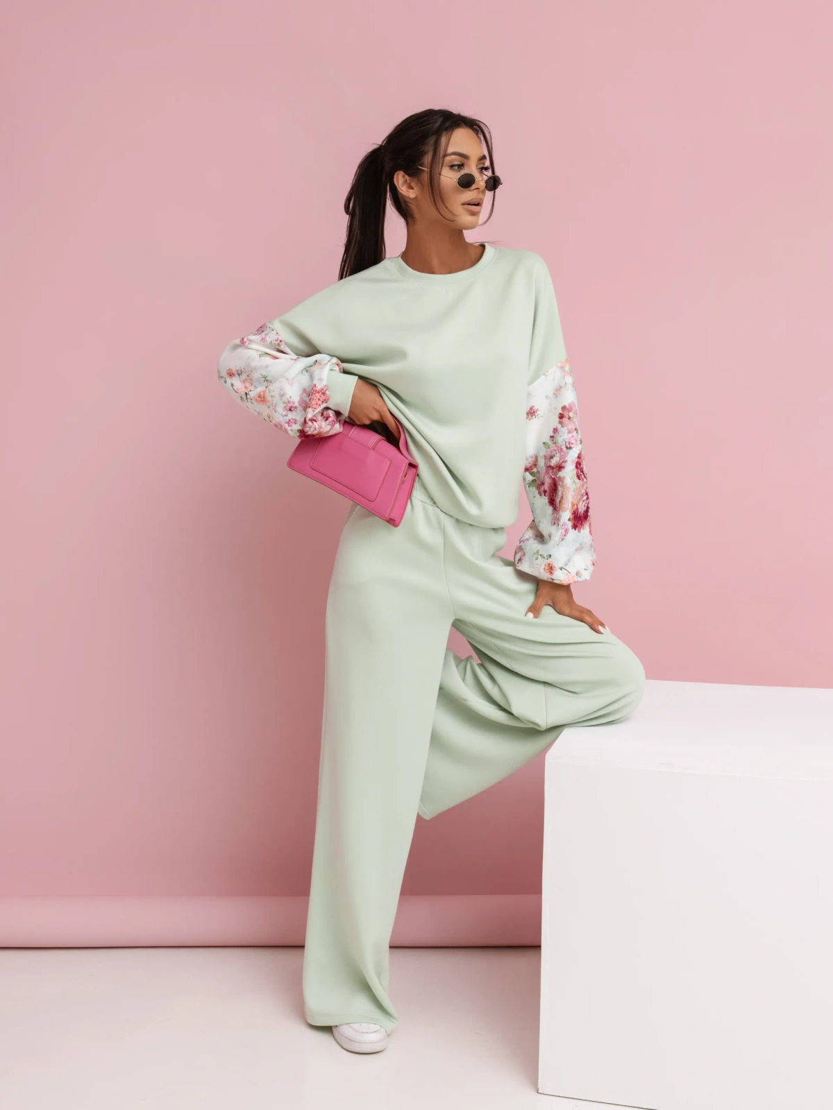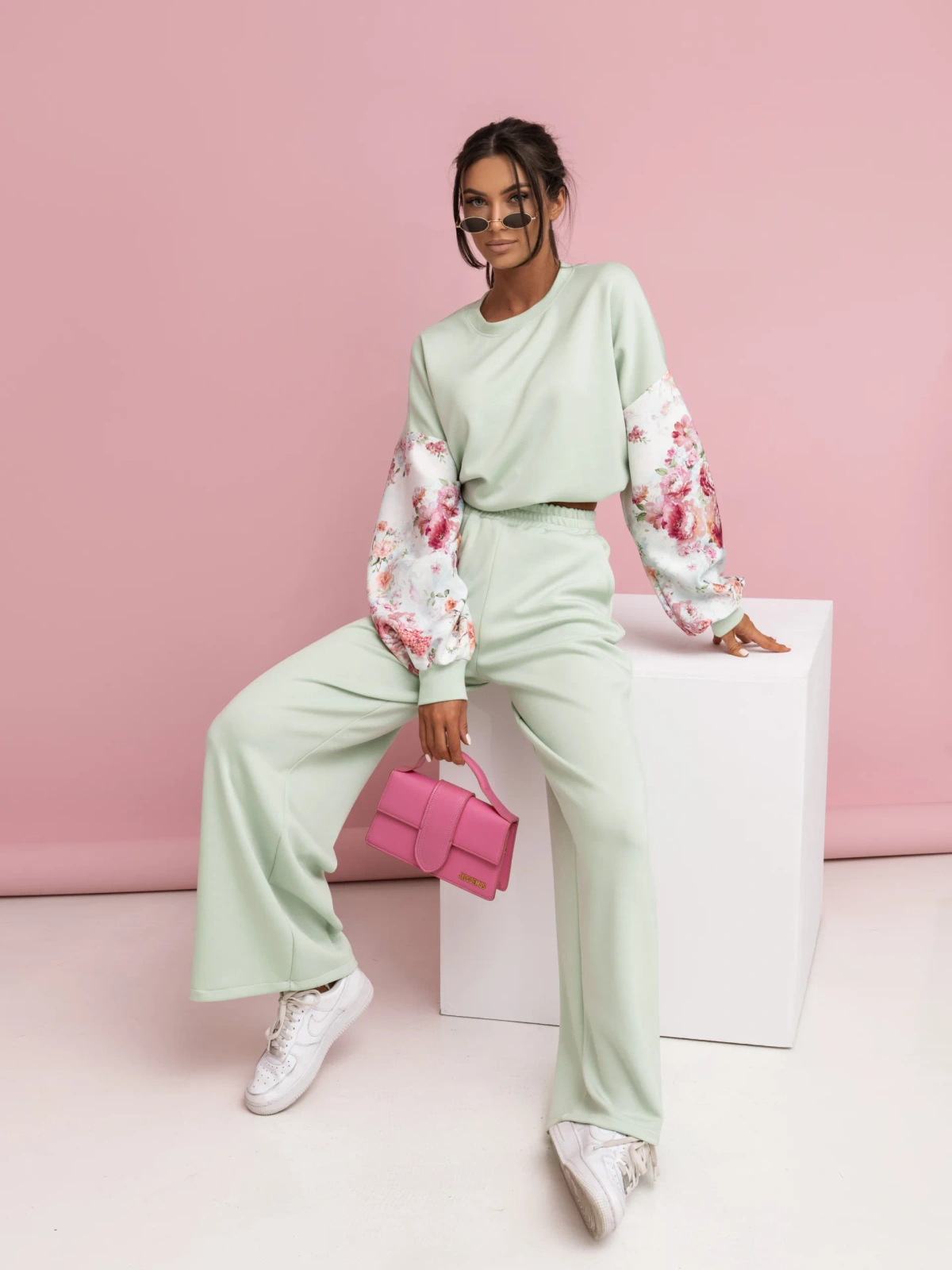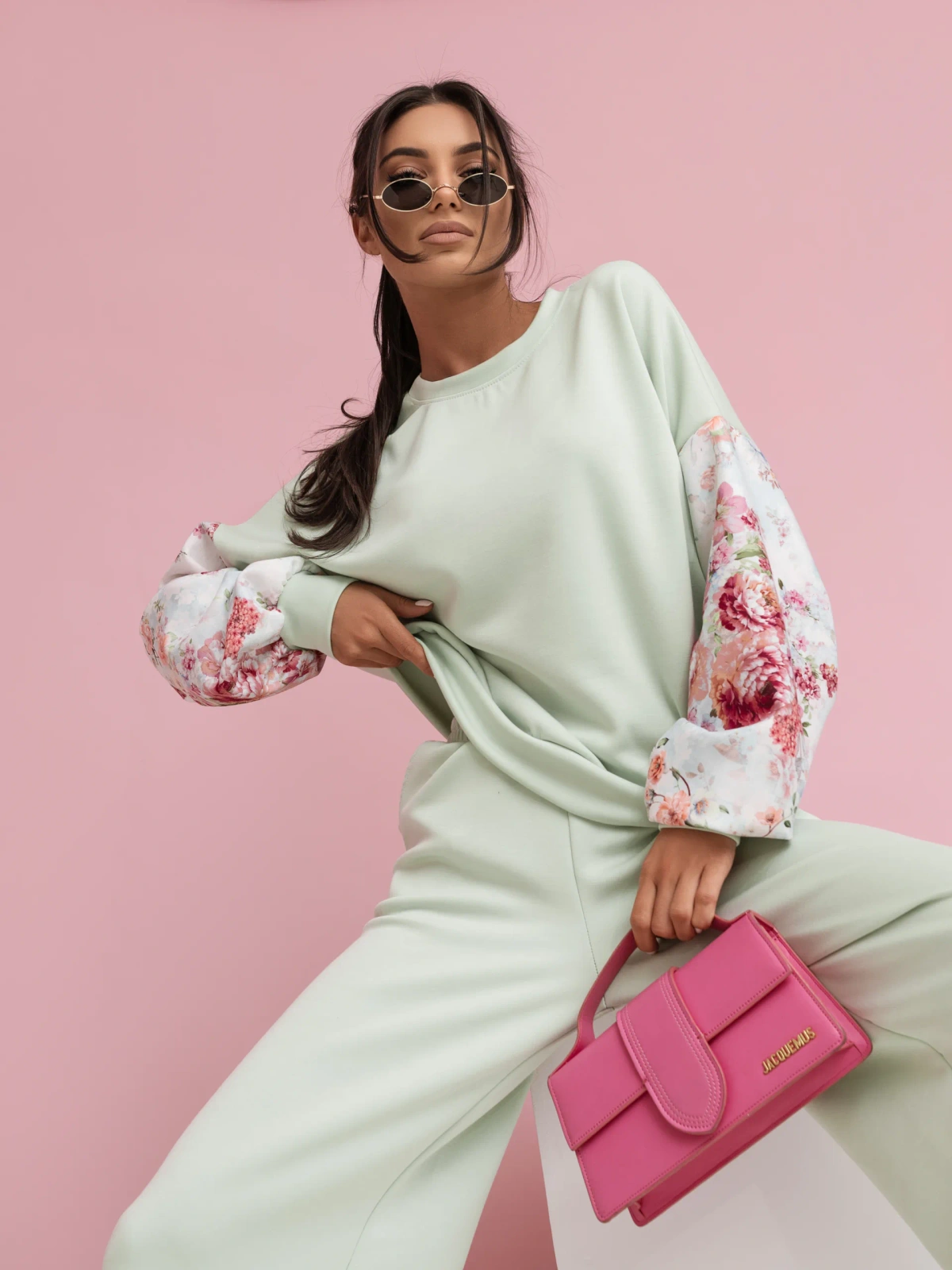 Bluza o luźnym kroju z klasycznym okrągłym dekoltem wyróżnia się ozdobnymi rękawami z kwiatowym printem, które nadają dresowi eleganckiego, kobiecego charakteru. Ten detal sprawia, że komplet doskonale łączy styl sportowy z subtelną elegancją.