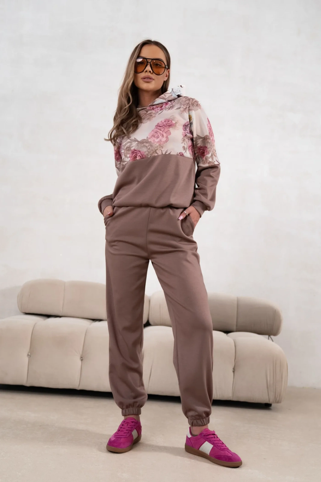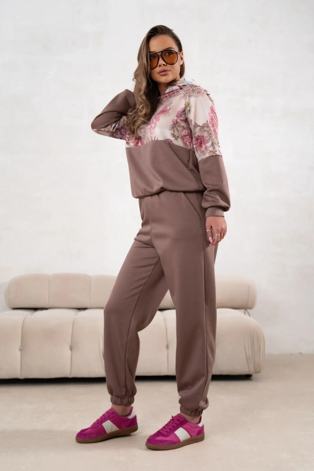 Damski dres dwuczęściowy wiskozowy cappuccino z kapturem i kwiatowym printem
