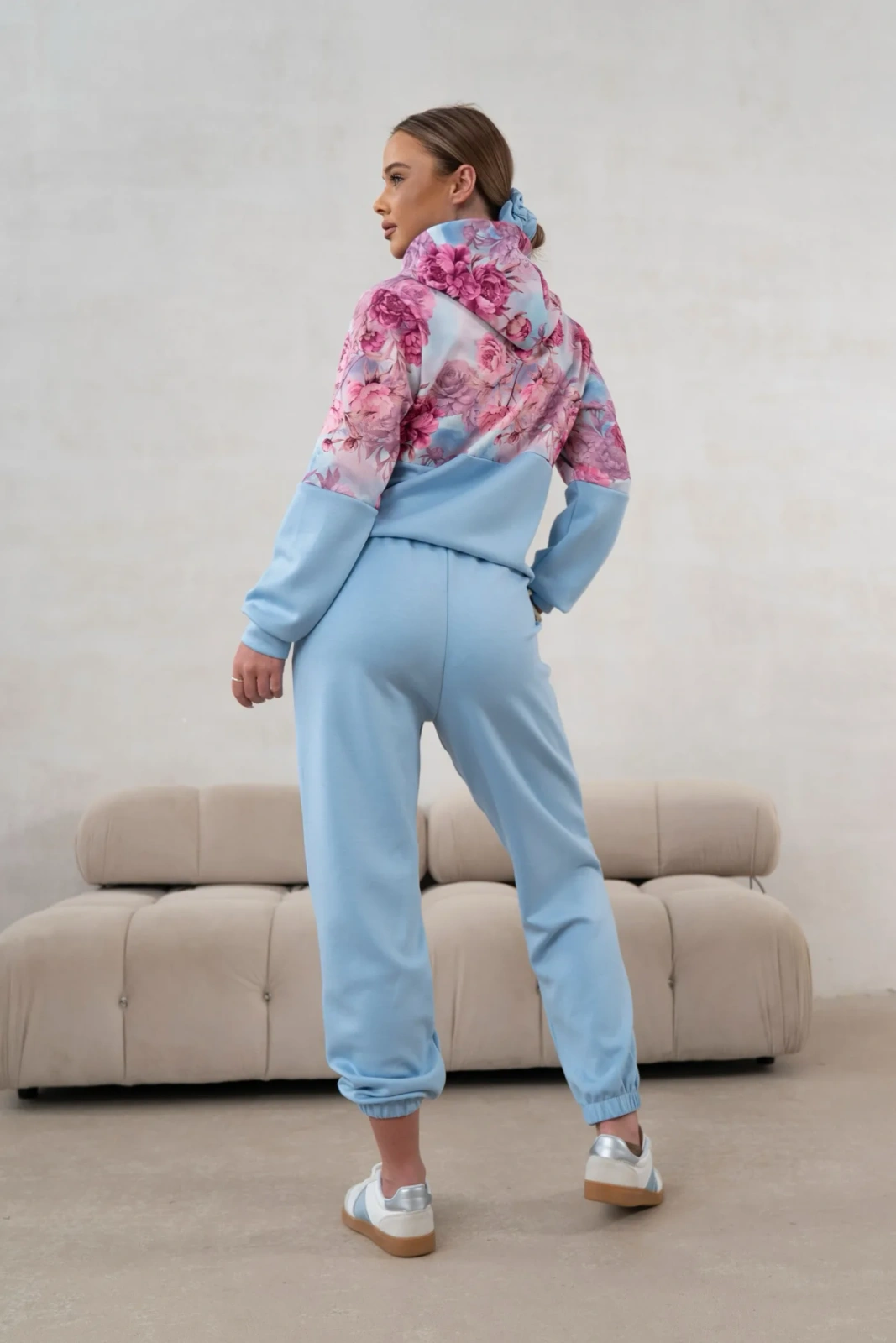 Damski dres dwuczęściowy wiskozowy niebieski z kapturem i kwiatowym printem