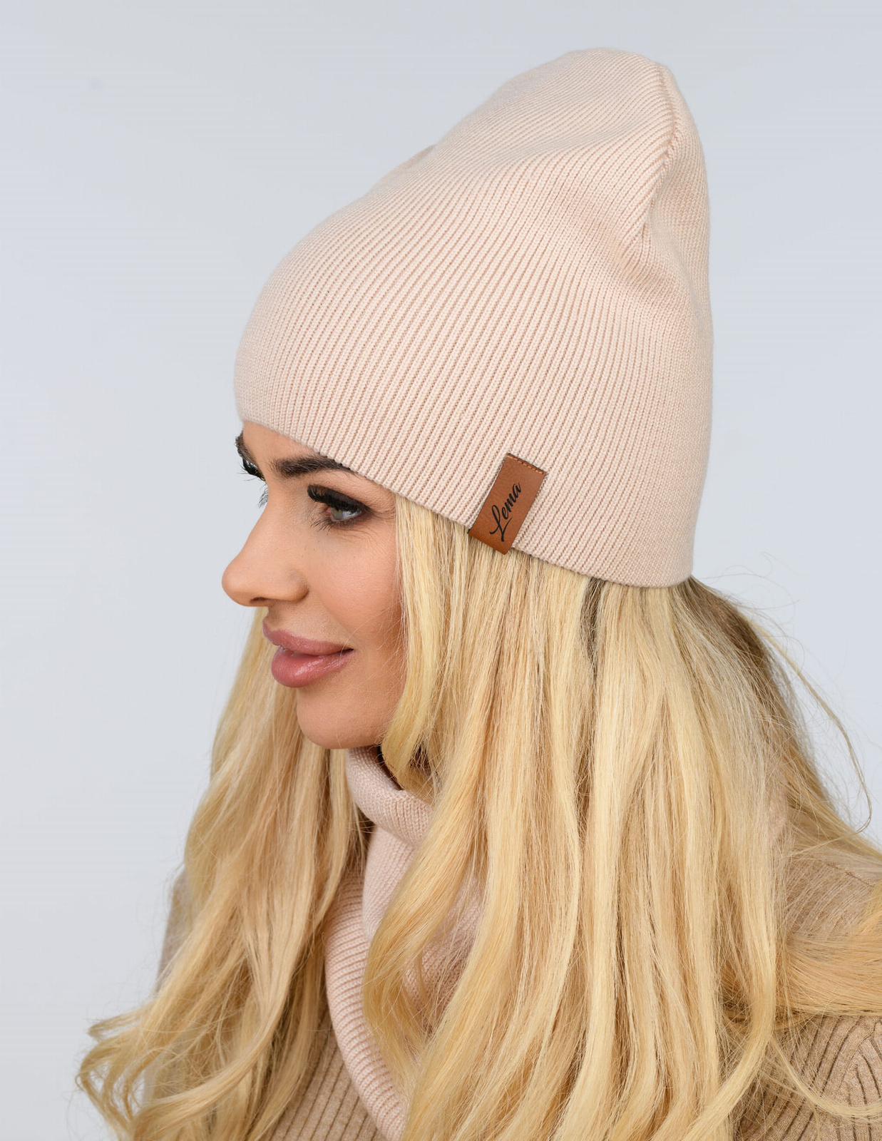 Beżowy kolor zestawu dodaje klasy i subtelności, pięknie podkreślając zimowe stylizacje. Wykonany z miękkiej wiskozowej przędzy, komplet LEMA jest niezwykle przyjemny w dotyku, ciepły i elastyczny. Klasyczny prążkowany wzór i skórzana etykieta z logo LEMA nadają mu wyjątkowego charakteru.