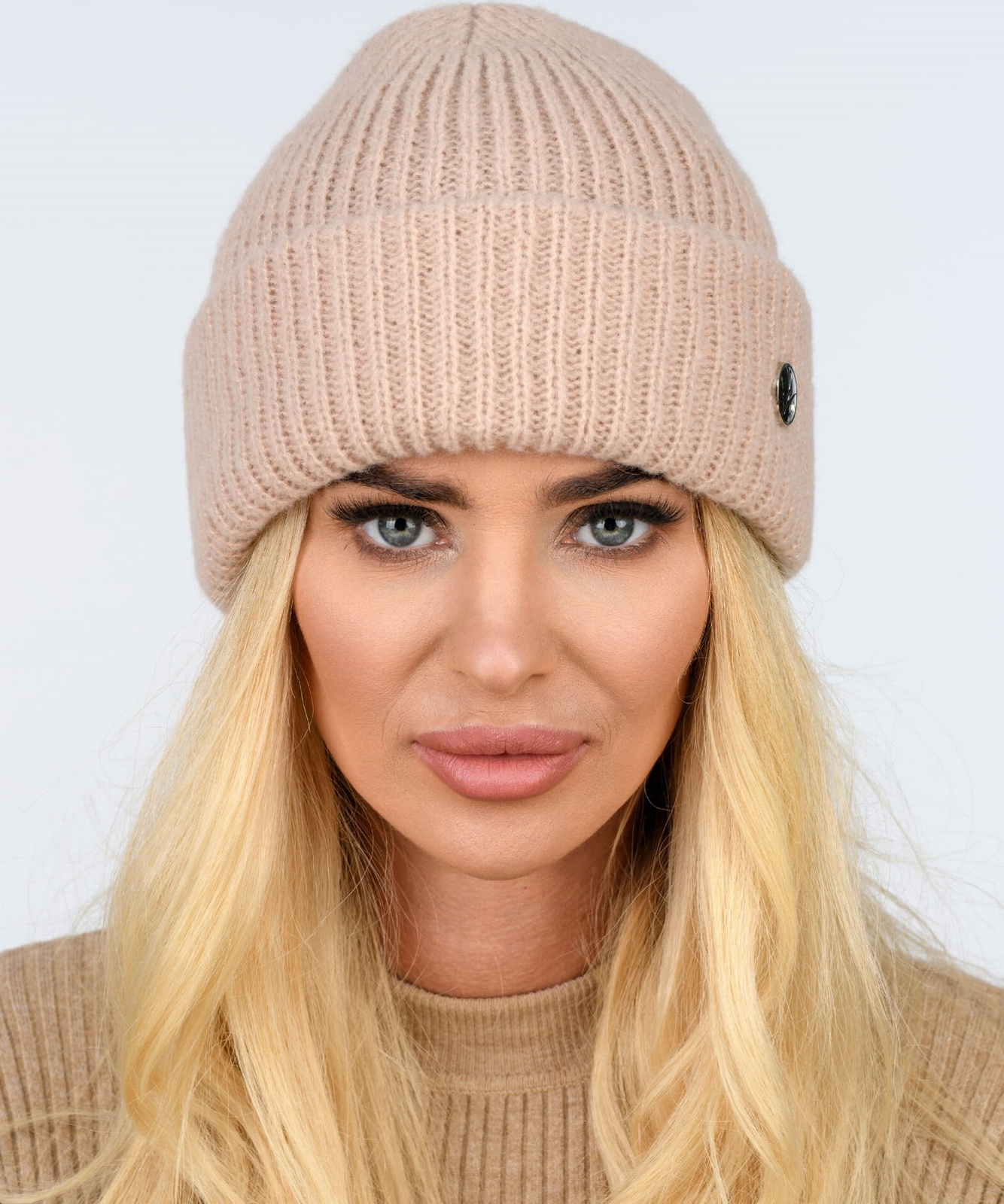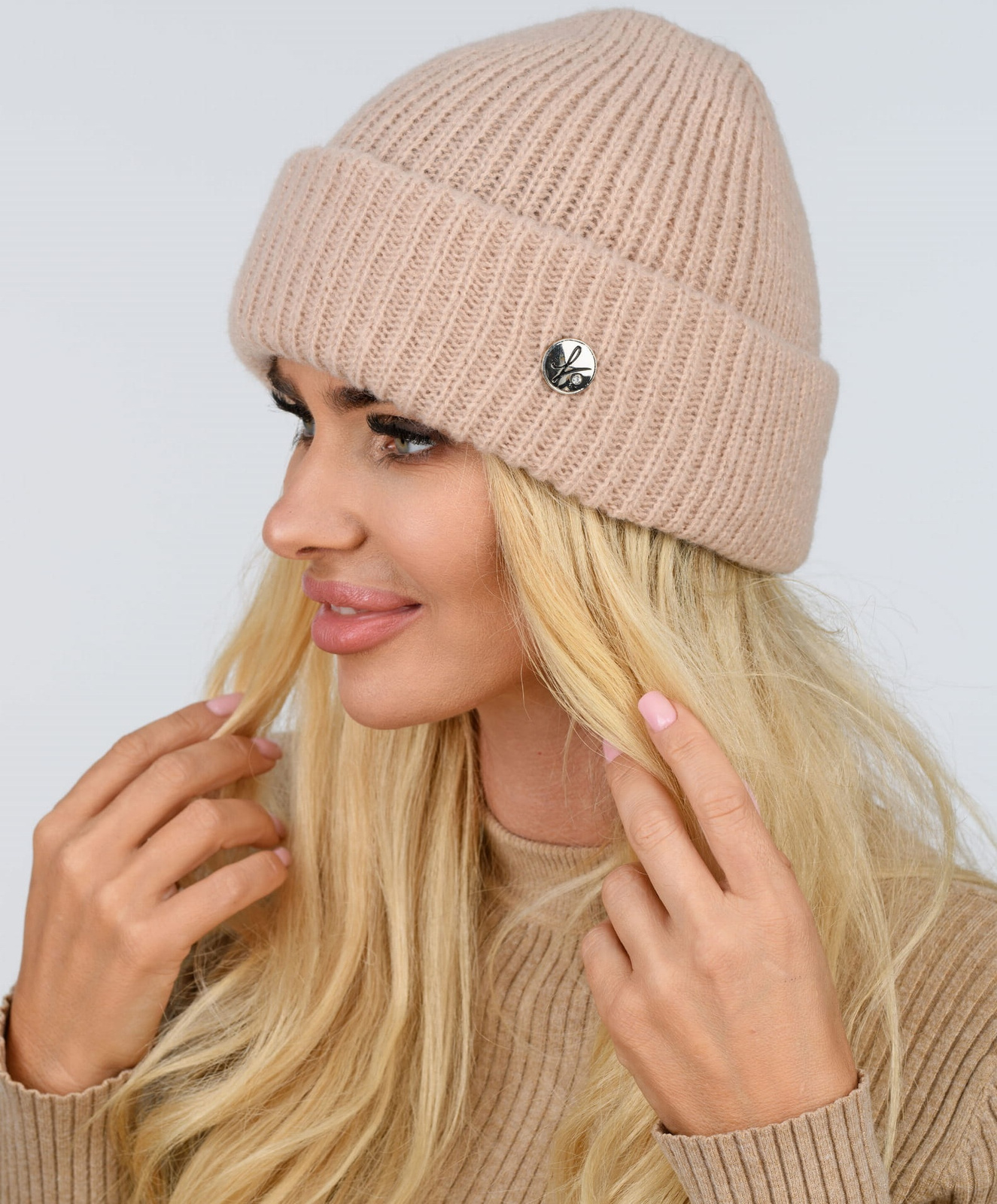 Modna zimowa czapka damska LEMA Tanya – beanie wywijana z broszką (kolor jasny beż)