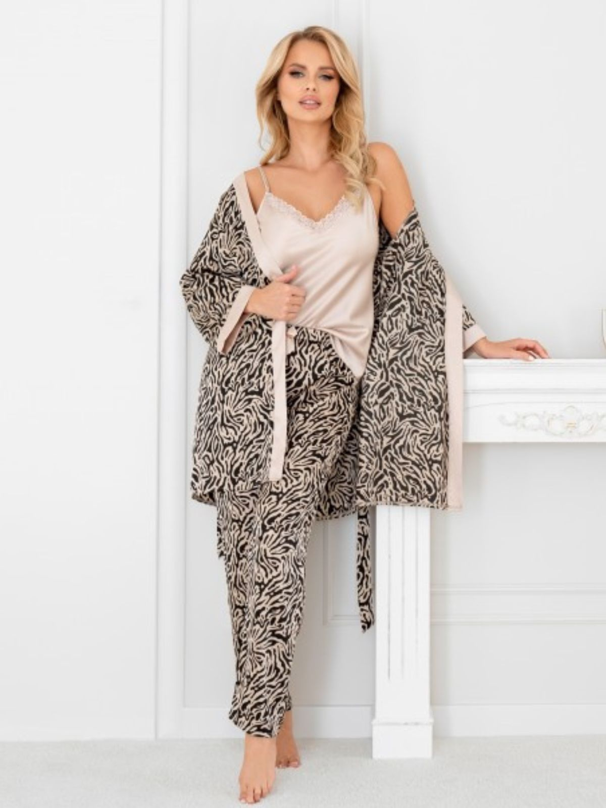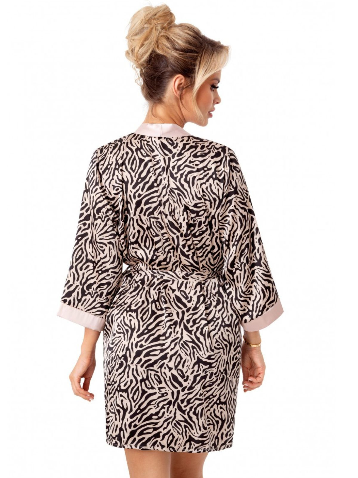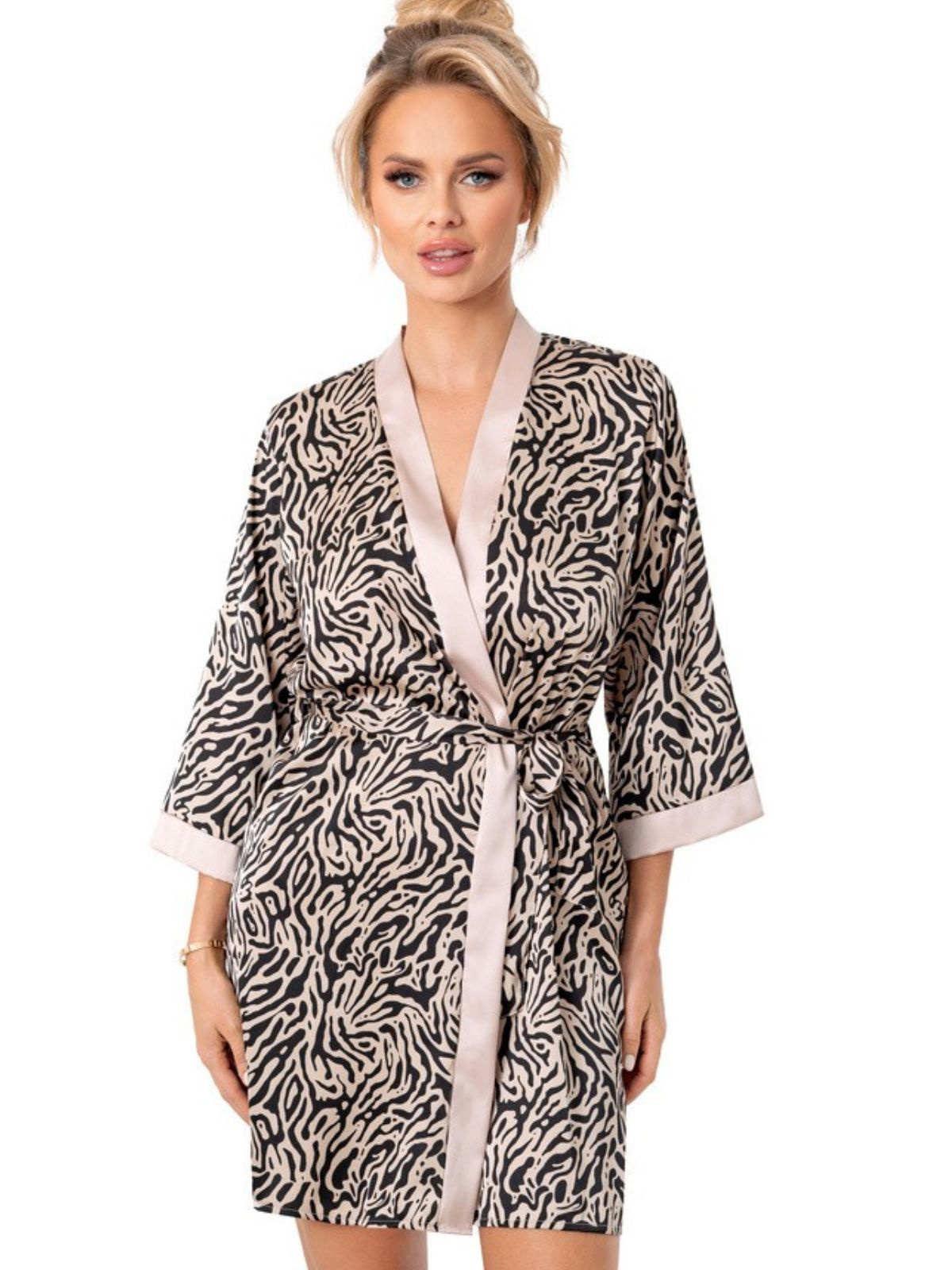 Odkryj szlafrok satynowy damski, który łączy w sobie wyjątkowy design, komfort i styl. Wykonany z delikatnej, miękkiej satyny, zapewnia luksusowe uczucie przy każdym dotyku. Satynowy szlafrok z printem w efektowny wzór zwierzęcy doda Twojej stylizacji niepowtarzalnego charakteru – to idealny wybór dla osób ceniących modne akcenty w domowym looku.
